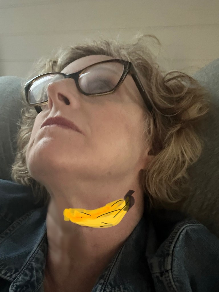 When big sister went home and the Dr. took out the icky drain, I looked at my new neck for a long time. The scar was bigger than I anticipated and had a curve; it was also lower and more toward the middle of my neck than advertised. Huh, would you look at that! My scar was shaped like a banana!