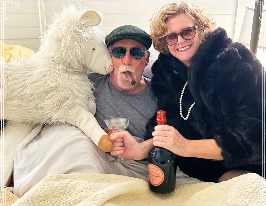 A preview of us in 2024, safe in our bed, celebrating our 20th anniversary, with NO STEROIDS (God willing), pearls (Dennis will have to eat a lot of Oysters), fine champagne, and a Llama.